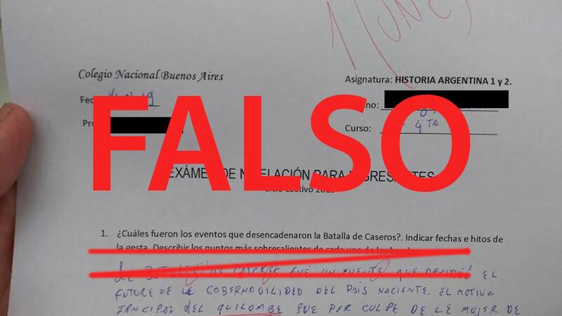 Sin embargo, la prueba de la foto es apócrifa: tal como destaca una investigación de Chequeado, está mal escrito el nombre del establecimiento educativo y el supuesto examen se realizó en una fecha no correspondiente con el ciclo lectivo. Además, el ex rector señaló en declaraciones radiales que la profesora y la alumna mencionadas en esta desinformación no existen y que ambos nombres son inventados.
