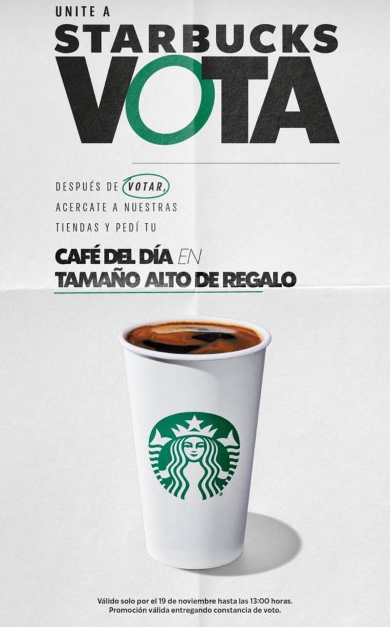 No obstante, la promoción rige hasta las 13 de este domingo 19 de noviembre. Además, es necesario presentar la constancia de voto para recibir el café de forma gratuita.