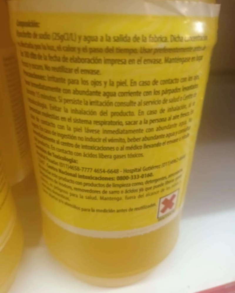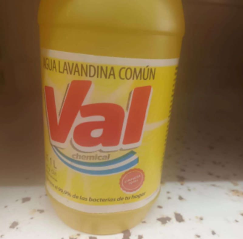 - “AGUA LAVANDINA COMÚN. Val chemical. Elimina el 99,9% de las bacterias de tu hogar. 25 g Cl/l. Compañía de Poliproductos Baigó S.A. – Atuel N°47 Hurlingham – Pcia. de Bs. As. www.valchemical.com.ar. RNE: N° 020045624″