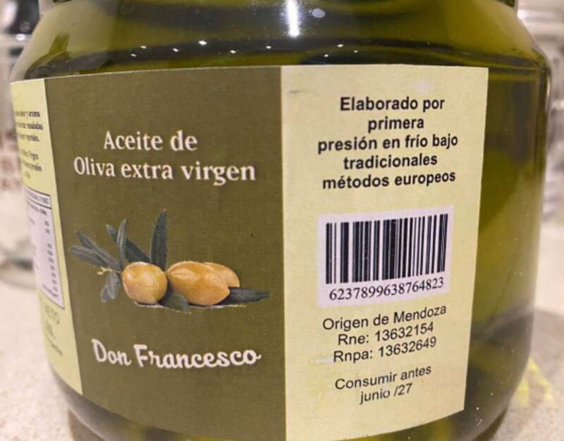 En particular, se trata de la marca de aceite de oliva marca "Don Francesco" catalogado como "Aceite de oliva extra virgen; marca Don Francesco; Origen de Mendoza; Rne: 13632154; Rnpa: 13632649".