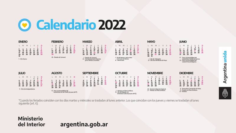 "Los feriados nacionales cuyas fechas coincidan con los días martes y miércoles serán trasladados al día lunes anterior. Los que coincidan con los días jueves y viernes serán trasladados al día lunes siguiente", amplía el artículo 6 de la Ley 27.399.
