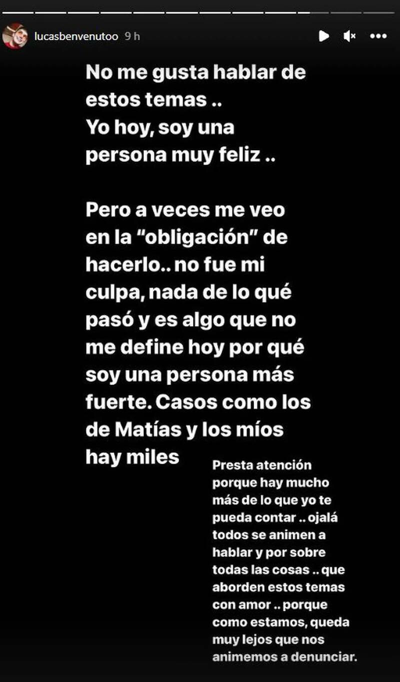 Rápidamente, la noticia estalló en el mundo del espectáculo y el joven realizó un descargo a través de sus redes: "No me gusta hablar de estos temas. Yo hoy soy una persona muy feliz. Pero a veces me veo en la ‘obligación' de hacerlo. No fue mi culpa nada de lo que pasó", expresó.