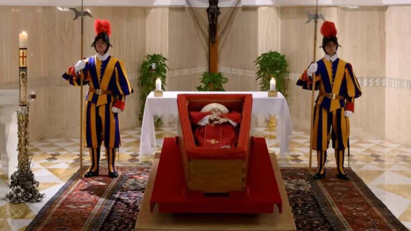 El féretro cerrado será llevado por los sediarios desde el interior de la basílica hasta el centro del "sagrado" en la Plaza de San Pedro, donde se colocará con el Evangelio encima.