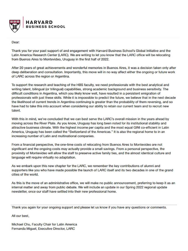 Pero lo que hasta ahora se coordinaba desde Buenos Aires, se volvió un desafío para la sede en el contexto actual: "Para apoyar la investigación y docencia de la HBS, necesitamos profesionales con el mejor talento analítico y de escritura, con capacidades bilingües (o trilingües), sólido background académico y sensibilidad de negocios. Las difíciles condiciones en Argentina, que ustedes seguramente conocerán bien, resultaron en una persistente emigración de profesionales con esas capacidades. Aunque es imposible predecir el futuro, creemos que en la próxima década la probabilidad de que se mantengan las tendencias actuales en Argentina es mayor que la de que se inviertan, y tuvimos que tener esto en cuenta cuando consideramos nuestra habilidad para retener a nuestro equipo actual y para reclutar nuevo talento", sentencia el comunicado.