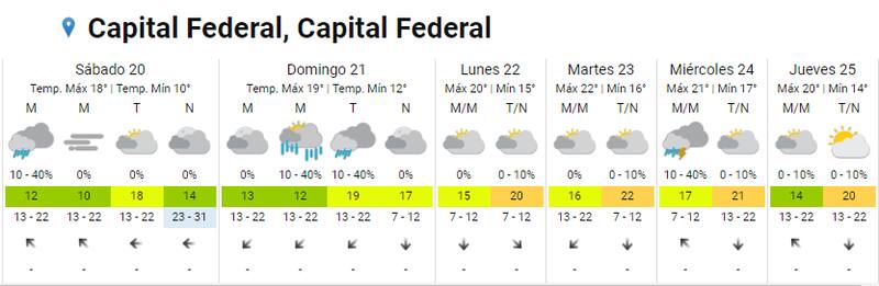 El sábado tendrá temperatura mínima de 10 grados y una máxima de 17, mientras que el domingo mostrará un cielo por momentos despejado y registrará una mínima de 13 grados con una máxima de 19° por la tarde pero con cielo mayormente cubierto.