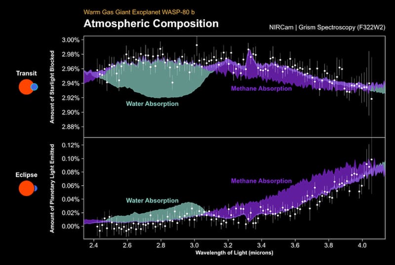La última imagen del telescopio espacial James Webb de la NASA ha revelado espectros indicativos de una atmósfera que contiene gas metano y vapor de agua en el exoplaneta WASP-80 b, según informa este miércoles la agencia espacial estadounidense.