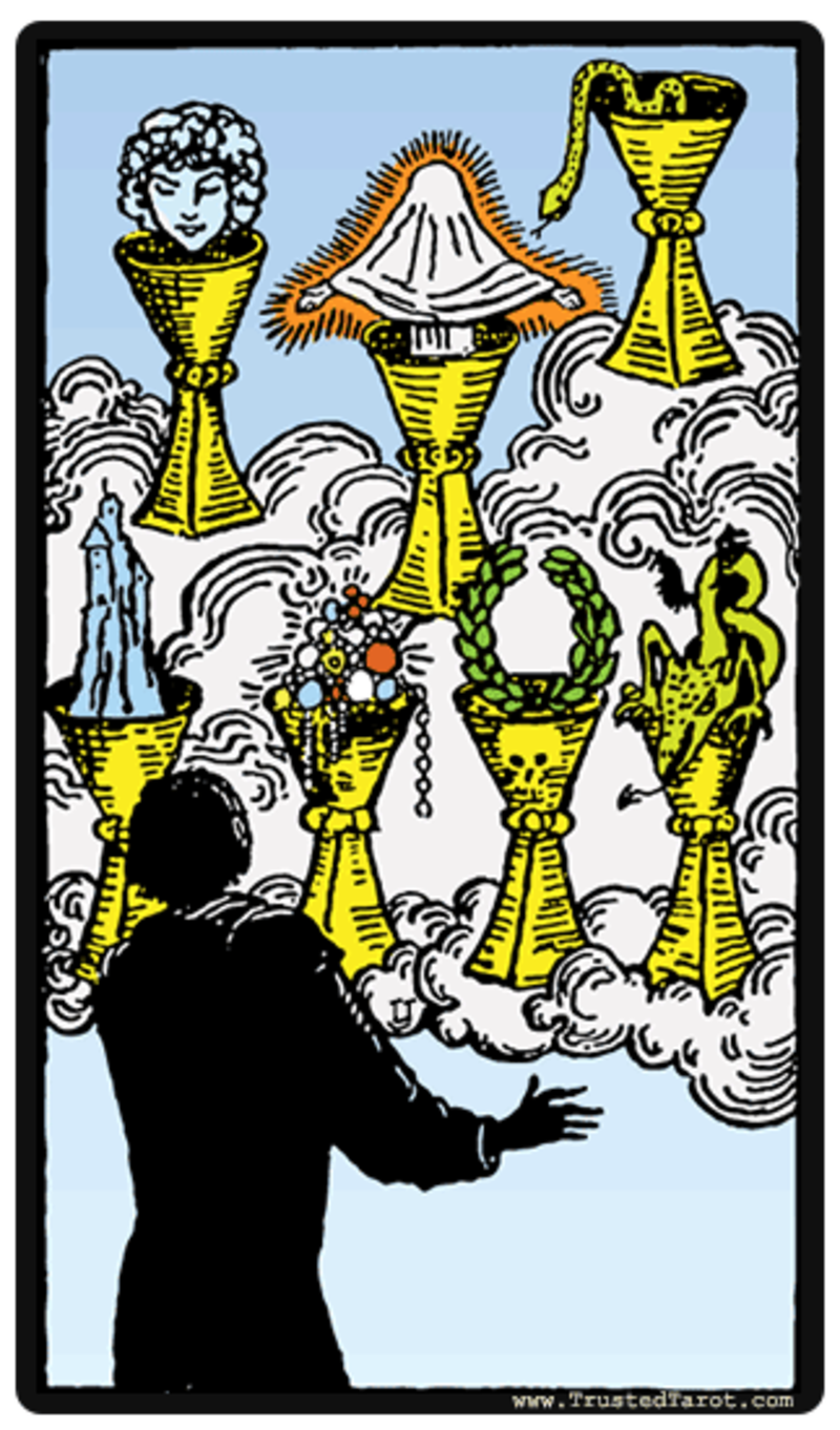 - Géminis: este signo tiene el 7 de copas, que muestra cuatro copas externas formando un rectángulo, con tres copas en el centro, trazando un eje vertical. La copa inferior representa la creación activa del mundo emocional, simbolizando la expresión del amor.