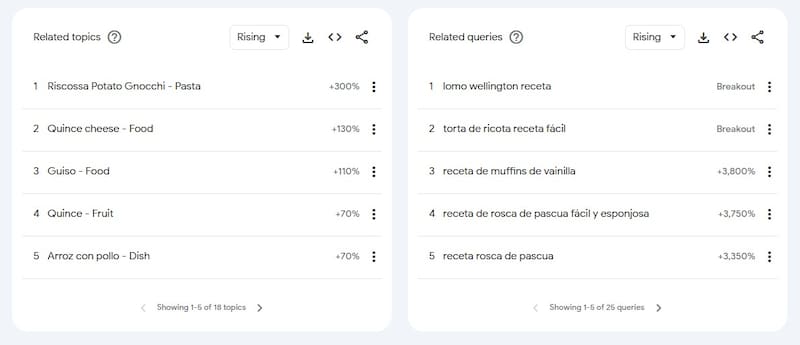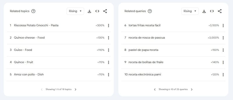 De hecho, dos de las cinco consultas con mayor crecimiento fueron directamente sobre esta preparación: “receta de rosca de pascua fácil y esponjosa” registró un aumento de 3.750% respecto al período anterior, mientras que “receta rosca de pascua” llegó a 3.350%.
