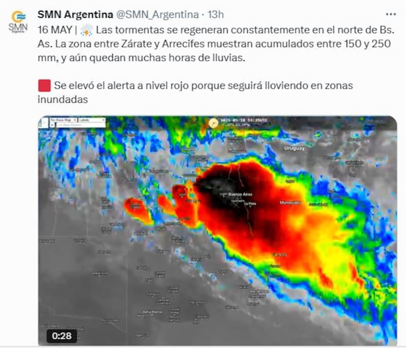 El Servicio Meteorológico Nacional (SMN) mantiene una alerta amarilla para la Ciudad de Buenos Aires y hay un alerta roja para los municipios de San Nicolás de los Arroyos, Ramallo, San Pedro, Baradero, Zárate, Campana, San Antonio de Areco, Capilla del Señor, Luján, Moreno, Marcos Paz, Cañuelas, Mercedes, Suipacha y San Andrés de Giles.