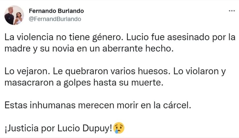 "La violencia no tiene género. Lucio fue asesinado por la madre y su novia en un aberrante hecho", escribió el letrado en su cuenta de Twitter.