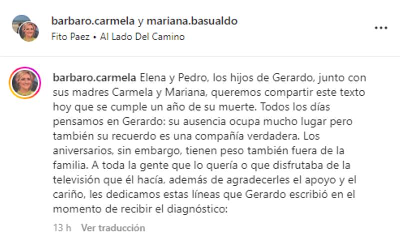 "Elena y Pedro, los hijos de Gerardo, junto con sus madres Carmela y Mariana, queremos compartir este texto hoy que se cumple un año de su muerte", escribieron en sus perfiles de Instagram.