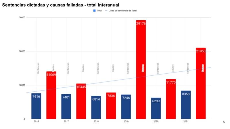 En la evolución interanual, tomando en consideración los últimos cinco años, 2021 marcó un récord en el dictado de sentencias. En efecto, el año que se cierra culmina con 8358, seguido en cantidad por el 2016 (7616 sentencias), 2017 (7401) y 2019 (7246).