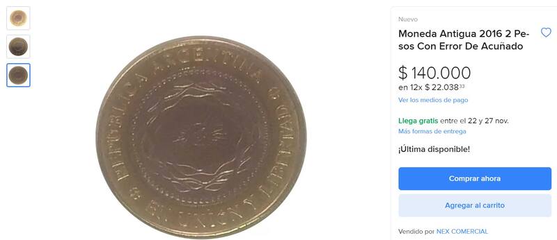 La moneda de $ 2acuñada en 2016 -que tiene un error de impresión se vende en Mercado Libre por $ 140.000.