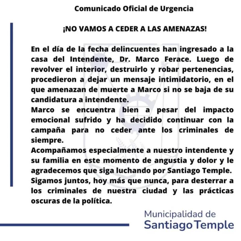 Marco Ferace, intendente de Santiago Temple (Córdoba), recibió una aterradoraamenaza de muerte, luego de que sospechosos ingresarán a su domicilio y le robaran sus pertenencias.