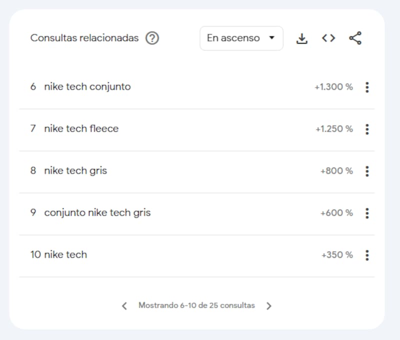 Lo más revelador aparece cuando entramos en las tendencias de búsqueda específicas, donde la plataforma nos muestra que las búsquedas más explosivas no tenían tanto que ver con la adquisición de un producto de Nike sino con el “modelo”.