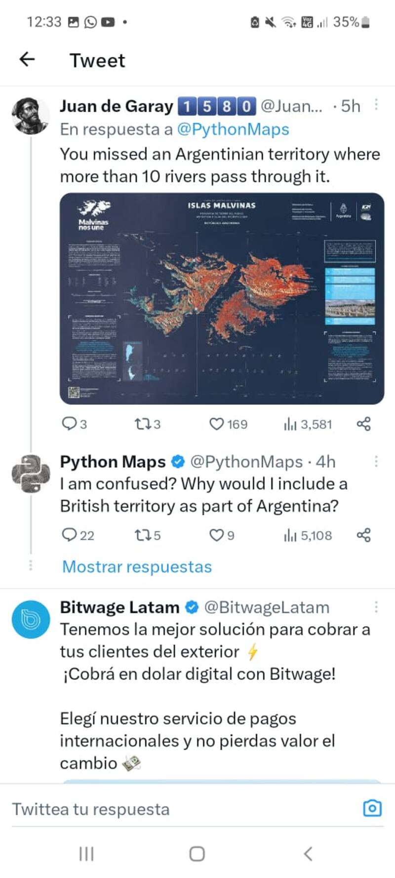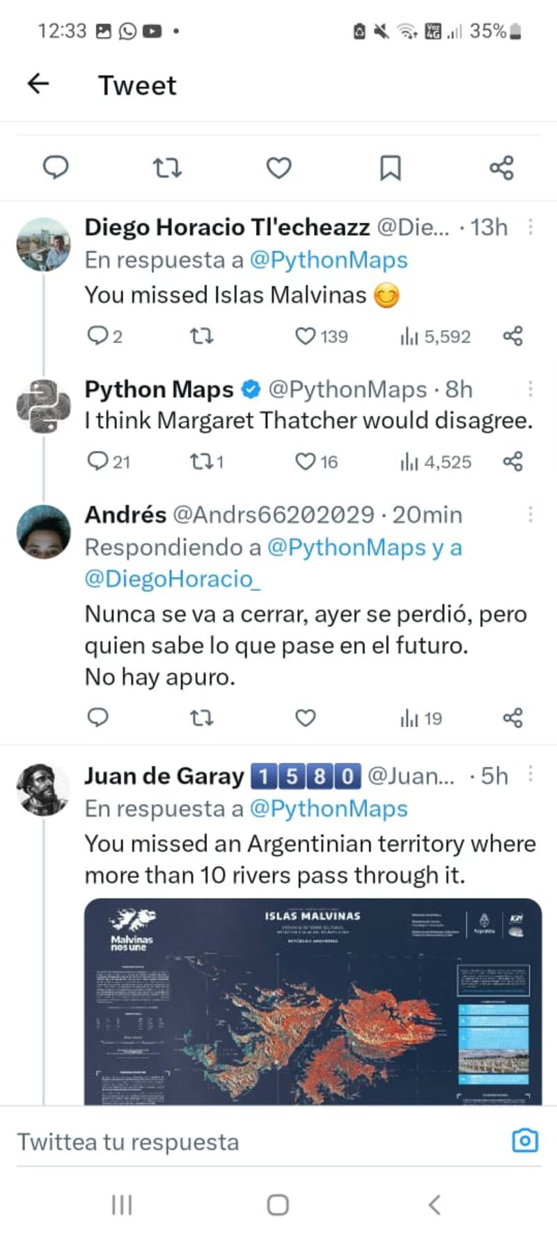 Luego de los comentarios, la propia cuenta de Python Maps, dirigida por el Dr. Adam Symington, un científico de datos geoespaciales del equipo de ciencia de datos de Fraym en Washington DC, arremetió de forma totalmente irrespetuosa y agresiva contra los usuarios argentinos, lo que provocó un escándalo en la red social.