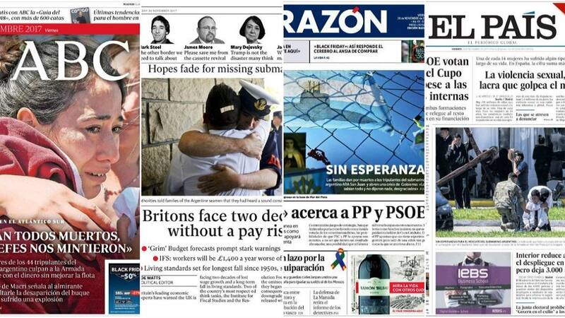 El matutino español El País también eligió una de las tantas fotos que dejó la jornada de ayer en Mar del Plata. "Sin esperanzas para el rescate del submarino argentino. La noticia de que hubo una explosión en la zona donde desapareció el sumergible con 44 tripulantes llenó ayer de desolación la base de la Armada en Mar del Plata", se lee debajo de la imagen.
