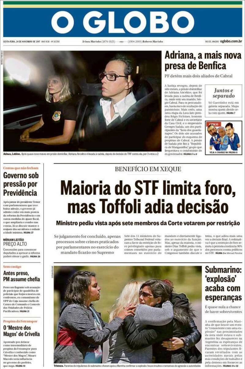El diario O'Globo, en cambio, titula: "Submarino: 'explosión' acaba con las esperanzas", y añade que "es casi nula la chance de encontrar sobrevivientes".