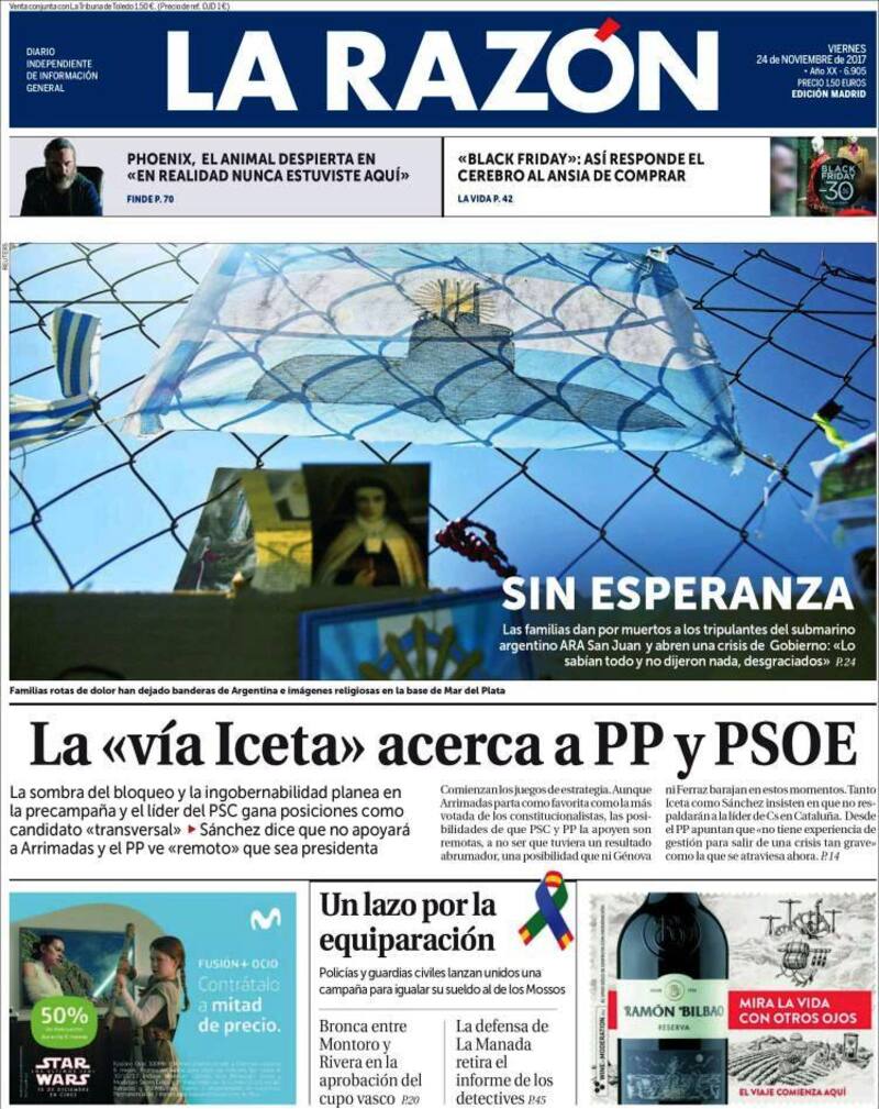 Otro diario español, La Razón, titula: "Sin esperanzas". Y resume: "Las familias dan por muertos a los tripulantes del submarino argentino ARA SAN Juan y abren una crisis de Gobierno: 'lo sabían todo y no dijeron nada, desgraciados'".