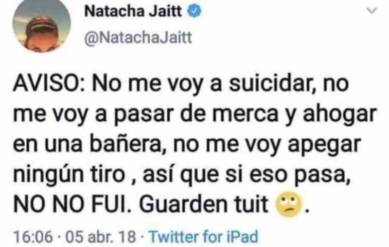 Pocos días después, escribió en su cuenta de Twitter: "No me voy a suicidar, no me voy a pasar de merca y ahogar en una bañera, no me voy a pegar ningún tiro, así que, si eso no pasa no, no fui. Guarden tuit".