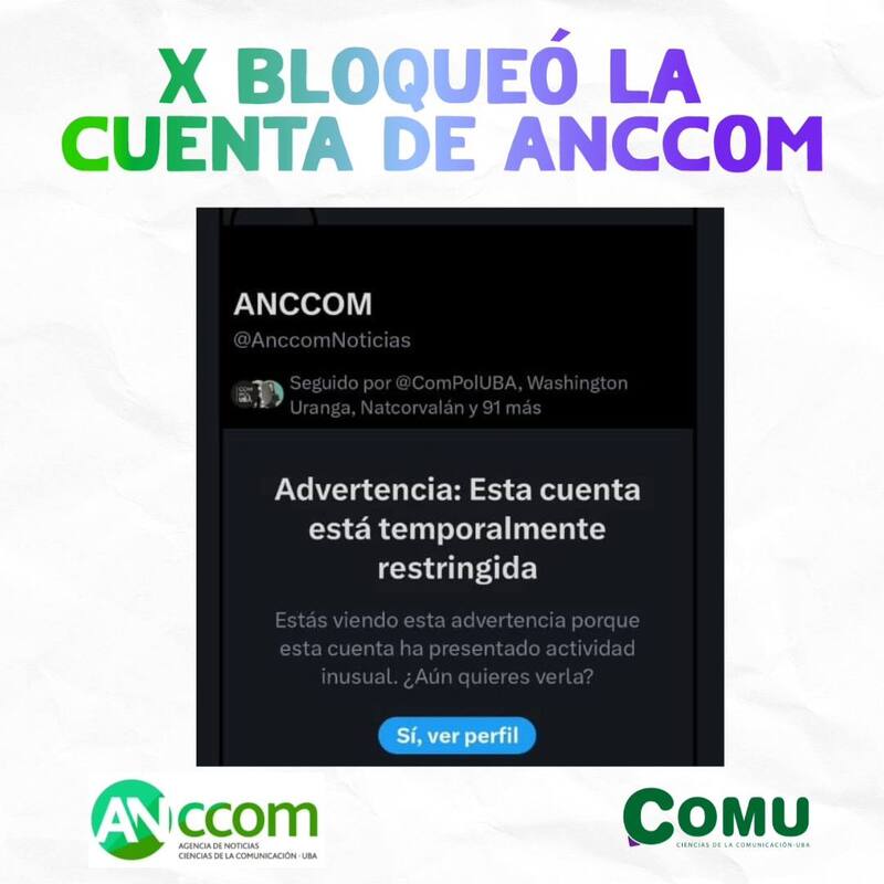 La carrera de Ciencias de la Comunicación de la Facultad de Ciencias Sociales de la Universidad de Buenos Aires (UBA)denunció en redes que este martes la empresa X de Elon Musk"restringió temporalmente" la cuenta de la agencia ANCCOM sin ofrecer explicaciones.