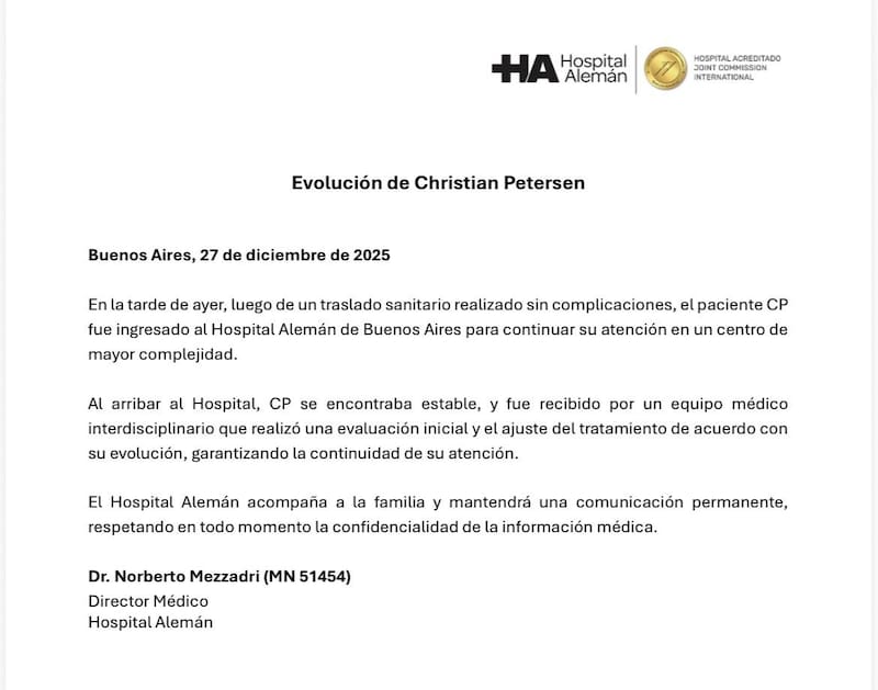 “En la tarde de ayer, luego de un traslado sanitario realizado sin complicaciones, el paciente CP fue ingresado al Hospital Alemán de Buenos Aires para continuar su atención en un centro de mayor complejidad”, detalla.