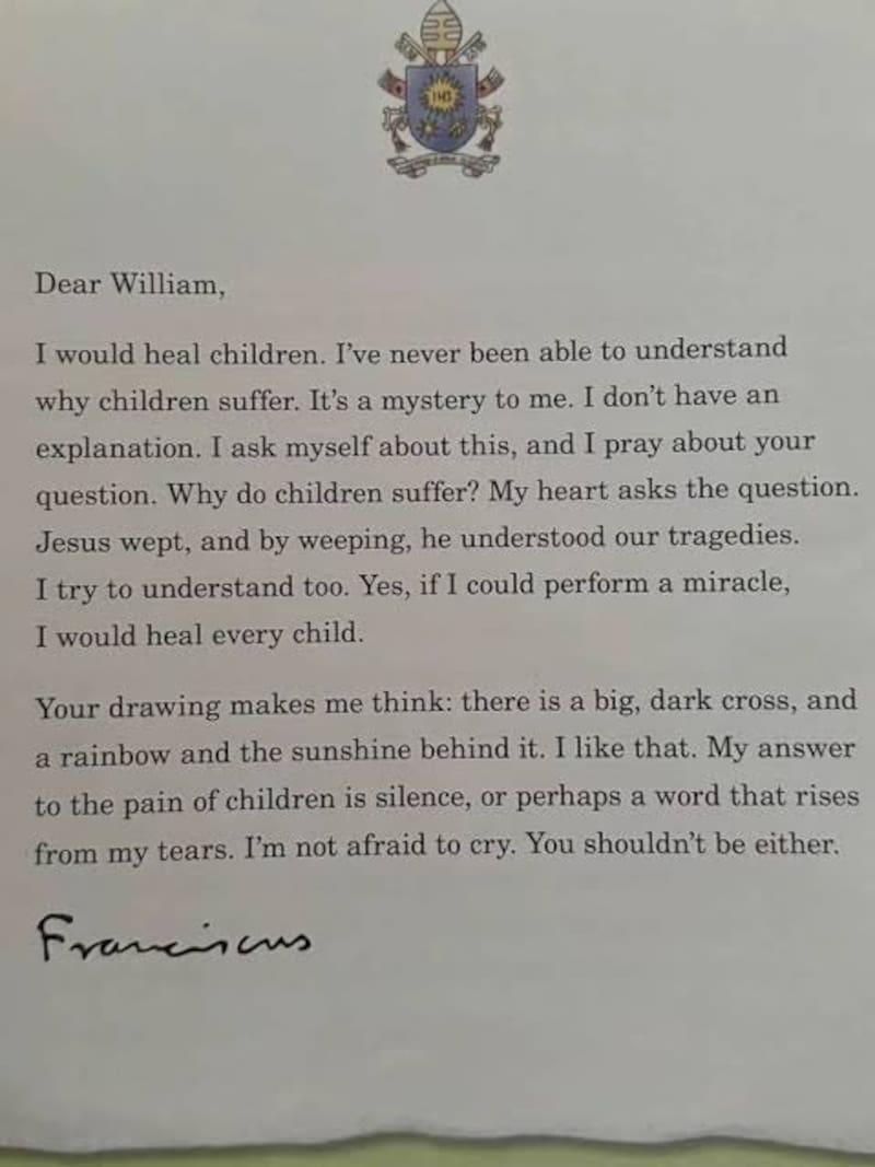 La correspondencia formó parte del proyecto literario “Querido Papa Francisco”. William acompañó su inquietud con un dibujo que incluyó una cruz, un arcoíris y un sol.