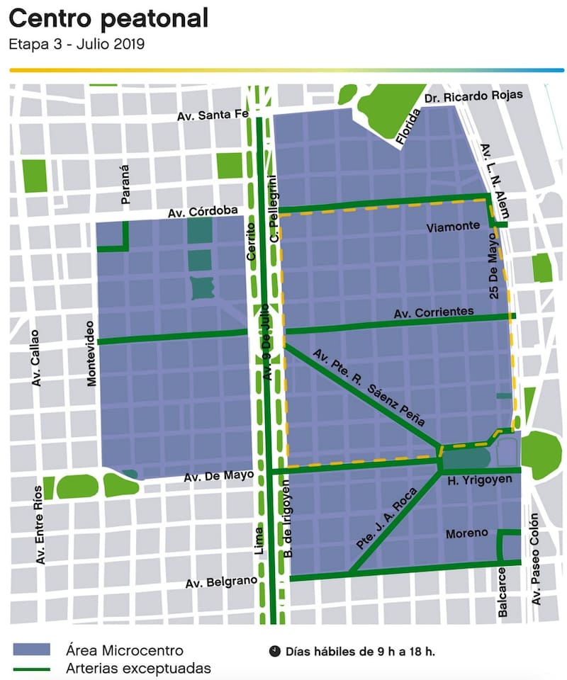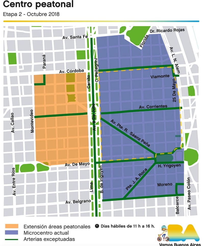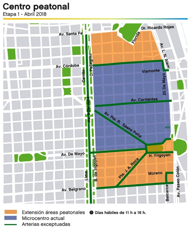 De esta forma, la única manera de moverse por la zona, entre las 11 y las 16, será a pie o en bicicleta. El área está delimitada por las calles Carlos Pellegrini, Bernardo de Irigoyen, San Martín y Florida; así como por las avenidas Belgrano, Paseo Colón, La Rábida, Leandro Alem y Santa Fe.