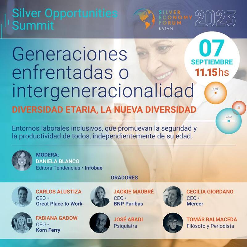 Entre los distinguidos oradores que compartirán sus perspectivas se encuentran figuras como el psiquiatra y psicoanalista José Abadi, la presidenta del Silver Economy Forum Latam, Liliana Parodi, la presidenta de BNP Paribas, Jackie Maubré, la Directora de Recursos Humanos para América Latina de Accenture, Laura Briano, la líder de EAF | Abogados de Adultos +55, Andrea Falcone, el CEO de Adecco Group, Leandro Cazorla, la representante de la Universidad San Andrés, Mercedes Jones, el ex Director Ejecutivo del PAMI, Carlos Regazzoni, el CPO de Ualá, Diego Solveira, el fundador de Presidentex, Paco González, el CEO de Digital House, Mariano Werchsler, la Co-Chair de WCD, Gabriela Terminielli, la CEO del Grupo Cohen, Anna Cohen, la CEO de Korn Ferry Cono Sur, Fabiana Gadow, la Gerente Comercial de Banco Santander, Silvia Tenazinha, el CEO de Great Place to Work, Carlos Alustiza, la CEO de Mercer, Cecilia Giordano, la representante del BID Lab, Erika Molina, la CEO de No Pausa, Miriam De Paoli, y Diego Martinez, CTIO de Movistar.
