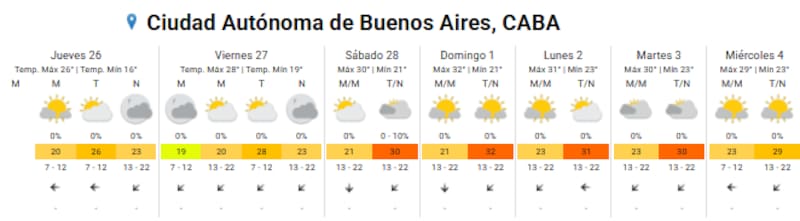 - Jueves 26: mínima de 16°C y máxima de 26°C, con el cielo parcialmente nublado.