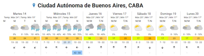 - Martes 14: mínima de 19°C y máxima de 24°C. Cielo mayormente nublado y chaparrones hacia la noche.
