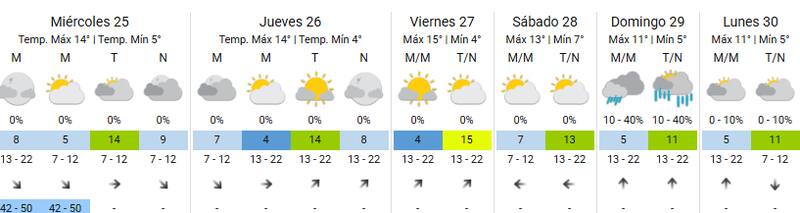 Para el domingo está pronosticado la caída de precipitaciones. Por la mañana habrán lluvias aisladas y por la tarde/ noche caerán chaparrones. La mínima será de 5° y la máxima de 11°.