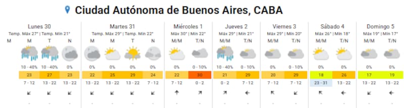 - Lunes 30: mínima de 21°C y máxima de 27°C, con chaparrones por la tarde.