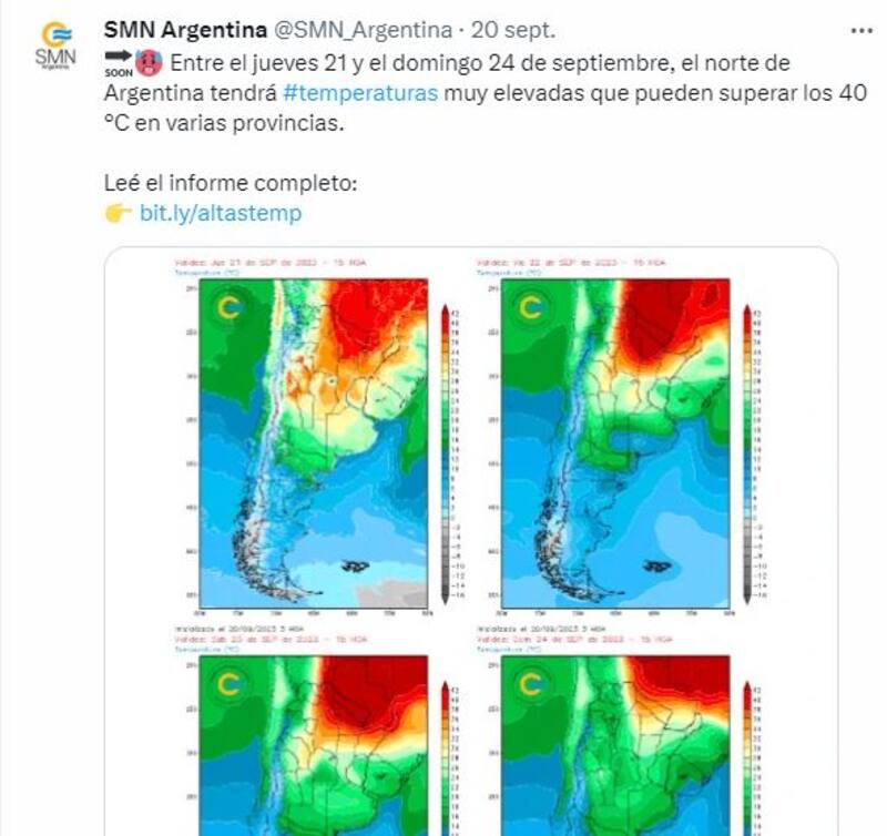 "Hasta el domingo 24 se esperan temperaturas máximas que en promedios estarán entre los 35 y los 43 grados, aunque pueden registrarse valores superiores en algunas localidades", indicaron desde el SMN.