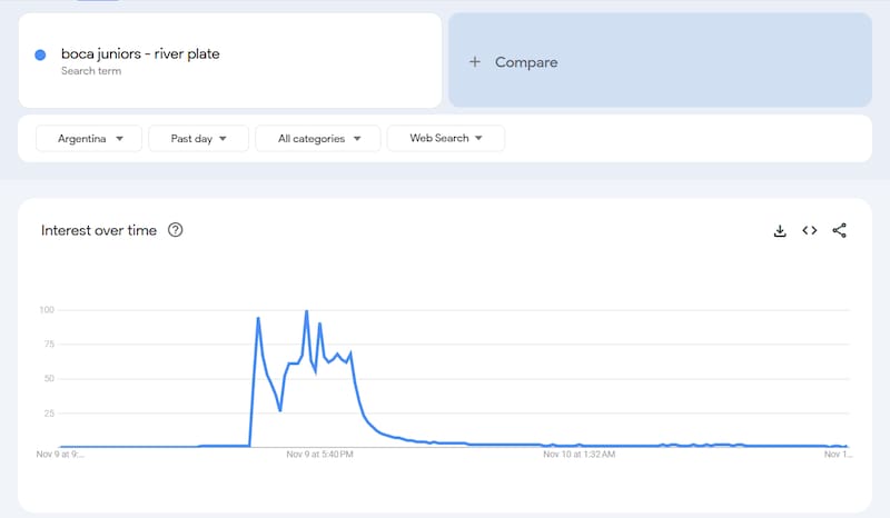 Al estudiar la tendencia de “boca juniors - river plate”, la búsqueda más alta de las últimas 24 horas (con más de 2 millones de entradas en el buscador) en Argentina, podemos trazar la línea de la ansiedad colectiva, demostrando cómo la gente recurre a Google en los momentos de mayor tensión deportiva.