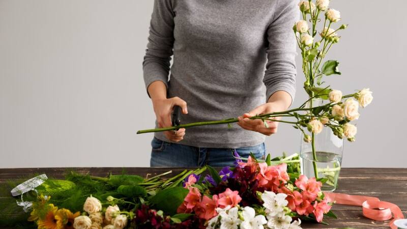 - Corte del tallo en ángulo: apenas adquiera las flores, es fundamental cortar el tallo en un ángulo oblicuo. Este corte en diagonal aumenta la superficie de absorción del agua, permitiendo que las flores beban más eficientemente.