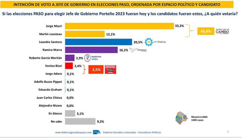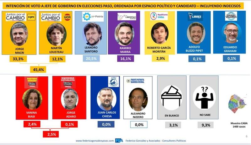 Una encuesta realizada por la consultora Federico González y Asociados midió la intención de voto de los habitantes de la Ciudad de Buenos Aires en las elecciones Primarias Abiertas, Simultáneas y Obligatorias (PASO) a jefe de Gobierno, e indicó qué candidato ganaría la postulación de Juntos por el Cambio para disputar las generales.