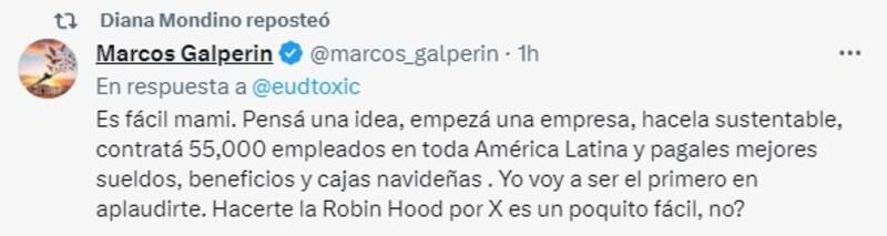 Desde su cuenta personal, Galperin le contestó: "Es fácil mami. Pensá una idea, empezá una empresa, hacela sustentable, contratá 55,000 empleados en toda América Latina y pagales mejores sueldos, beneficios y cajas navideñas . Yo voy a ser el primero en aplaudirte".
