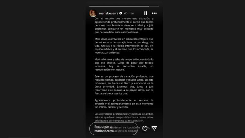 Mediante una historia en el perfil de María Becerra, sus familiares indicaron: "Con el respeto que merece esta situación y agradeciendo profundamente el cariño que tantas personas han brindado siempre a Mari y Juli, queremos compartir un momento muy delicado que ha sucedido en las últimas horas".
