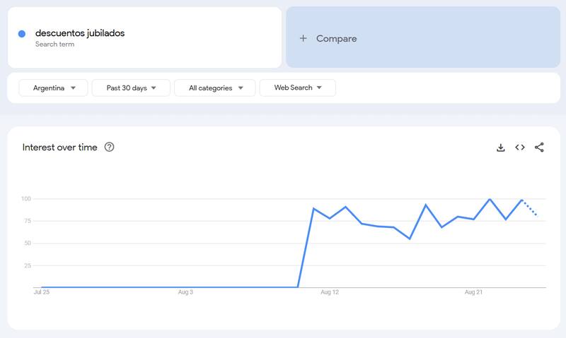 El gráfico de 30 días nos muestra una explosión de interés a partir del 8 de agosto pero, a diferencia de lo que se cree en una primera impresión, este pico no fue causado por un anuncio oficial, sino que refleja una búsqueda activa por parte de los jubilados, probablemente motivada por la necesidad de encontrar ahorros ante un contexto de precios cambiantes.