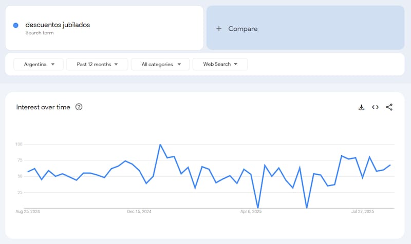 Si la búsqueda de préstamos es la excepción, la búsqueda de "descuentos jubilados" es la regla. Este gráfico nos muestra un interés de búsqueda sostenido y en un nivel base alto a lo largo de los 12 meses. Esta constancia revela que el ahorro no es una moda o una necesidad temporal, sino una estrategia diaria en un contexto inflacionario.