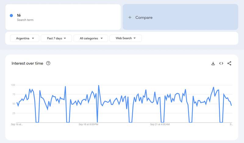 Los picos se dan consistentemente por las mañanas y por las tardes-noches, lo que coincide con los horarios tradicionales de desayuno y merienda donde además de consumirse el té se comparte con la familia. Esto no solo confirma que el té es una infusión de consumo habitual para los argentinos, sino que su búsqueda en Google es parte de un ritual.