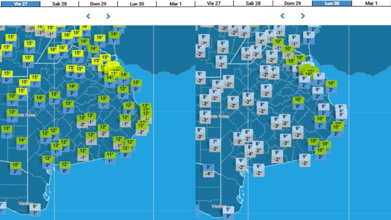 En cuanto a los días más fríos de estas semanas se dará el domingo 29, con un mapa que adelanta que, por ejemplo,Sierra de la Ventana llegará a -3°C, mientras que las ciudades aledañas lo seguirán. Allí, las máximas ni siquiera pasarán los 8°C y el lunes seguirá el mismo panorama.