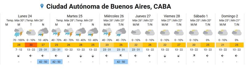 El pronóstico para la Ciudad de Buenos Aires indica que durante la mañana del lunes comenzarán las tormentas con posibles lluvias. Para la noche se espera que la tormenta traiga ráfagas de viento que pueden oscilar entre los 24 y 50 km/h. En la misma línea, la temperatura mínima será de 26° y escalará hasta los 30°.