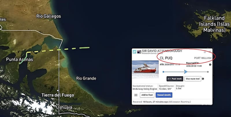 Desde la página Marine Traffic señalaron que el buque hizo escala en Puerto Williams, una ciudad chilena ubicada en la Costa sur del Canal Beagle. El aspecto más crítico de la misión no solo es su proximidad a la costa argentina, sino también el hecho de que la embarcación esté identificada en los sistemas internacionales como Falkland Islands Overseas Territory, cuya existencia para Argentina es desconocida e ilegal.