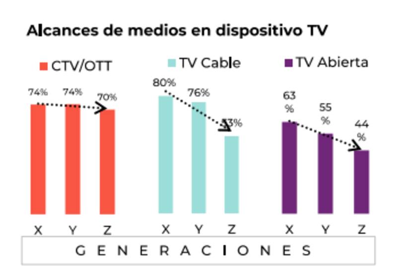 Entre los argentinos, con conexión a internet, las OTTs (Over the top, en inglés) en TV conectadas, tienen un éxito masivo. 7 de cada 10 adultos de la Generación X miran algún tipo de plataforma de contenidos, teniendo la misma proporción que los Millennials y un par de puntos por encima de los Centennials. La TV Cable continúa con una alta aceptación entre los adultos, pero cae significativamente entre los jóvenes (-34%).