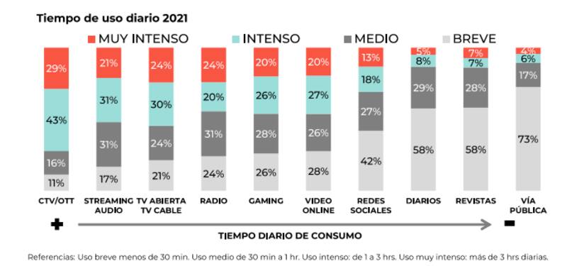 De hecho, otro dato fuerte que comparte el estudio, es que el promedio de consumo diario de cada uno de los medios. Allí se reflejando dos grandes grupos, los de consumo acotado (Revistas y Diarios) y los de uso prolongado (el resto de los medios, de Redes Sociales en adelante). El 56% de los usuarios de las Revistas y Diarios dicen tener un uso breve (menos de 30') vs. las OTTs, StreamingdeAudio o TV que tienen un uso intenso (el 60% de sus usuarios los usan más de 1 hora por día, cada medio).