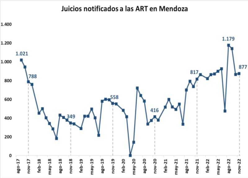 Sin embargo, hacia fines de 2019 comenzó a observarse un repunte que fue interrumpido por la pandemia. Y con el regreso al normal funcionamiento de los juzgados, la judicialidad creció de forma sostenida durante 2021 y 2022, alcanzando el pico de 1179 notificaciones en agosto pasado en la provincia cuyana.