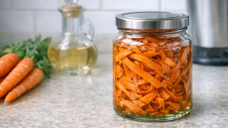 La combinación de vinagre con cáscara de zanahoria aprovecha las propiedades ácidas del vinagre y los aceites naturales y antioxidantes presentes en la zanahoria. El resultado es un limpiador multiuso casero que desinfecta, neutraliza olores y aporta brillo a superficies de vidrio o acero, reduciendo además el desperdicio de alimentos.