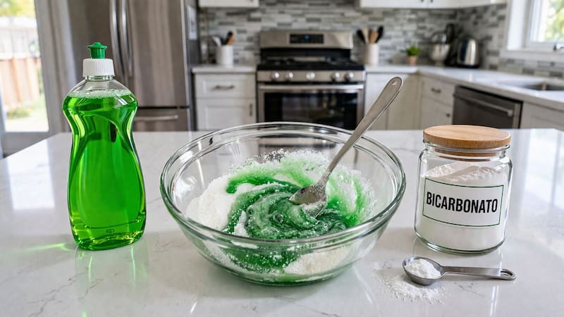 Para esta preparación se deberá reunir 2 cucharadas de detergente líquido, 1 una de bicarbonato de sodio y 1 una azúcar. Luego, seguir los siguientes pasos: